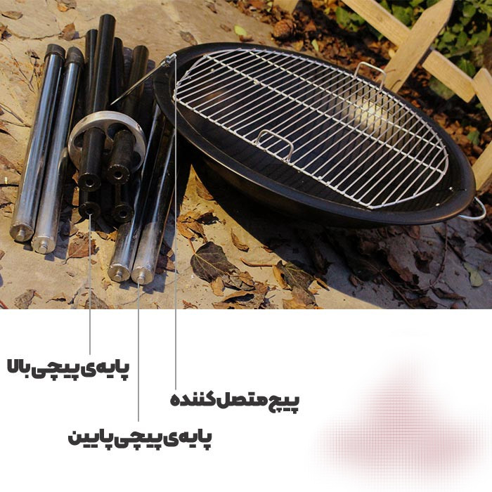 سایر توضیحات: مناسب برای : کبابی و گریل کردن جنس : لعابی شعاع آتشدان : 59 سانتیمتر طول پایهها در حالت نصب : 100 سانتیمتر طول پایهها در حالت بسته : 50 سانتیمتر ابعاد گریل : 38 × 49 سانتیمتر وزن : 7800 گرم