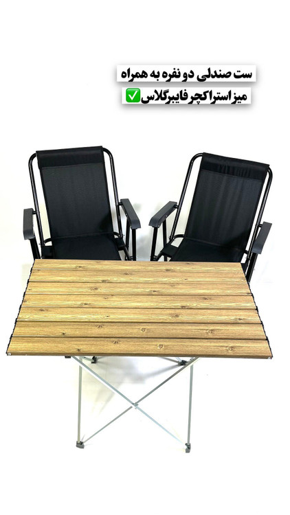 ست میزو صندلی تاشو دسته مبلی مسافرتی 2 نفره دارای 7 فنر و فوم دار متریال ها: پارچه سومیت، فلزضد زنگ , فوم و تسمه ی تقویت کننده ,میز از جنس فایبر گلاس با مقاومت بالا