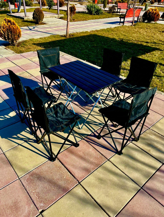 میز و صندلی تاشو کمپینگ و مسافرتی 6 نفره با طراحی سبک و مقاوم، مناسب برای کمپینگ، پیکنیک و فعالیتهای فضای باز، با قابلیت حمل آسان و مقاومت در شرایط مختلف جوی است.