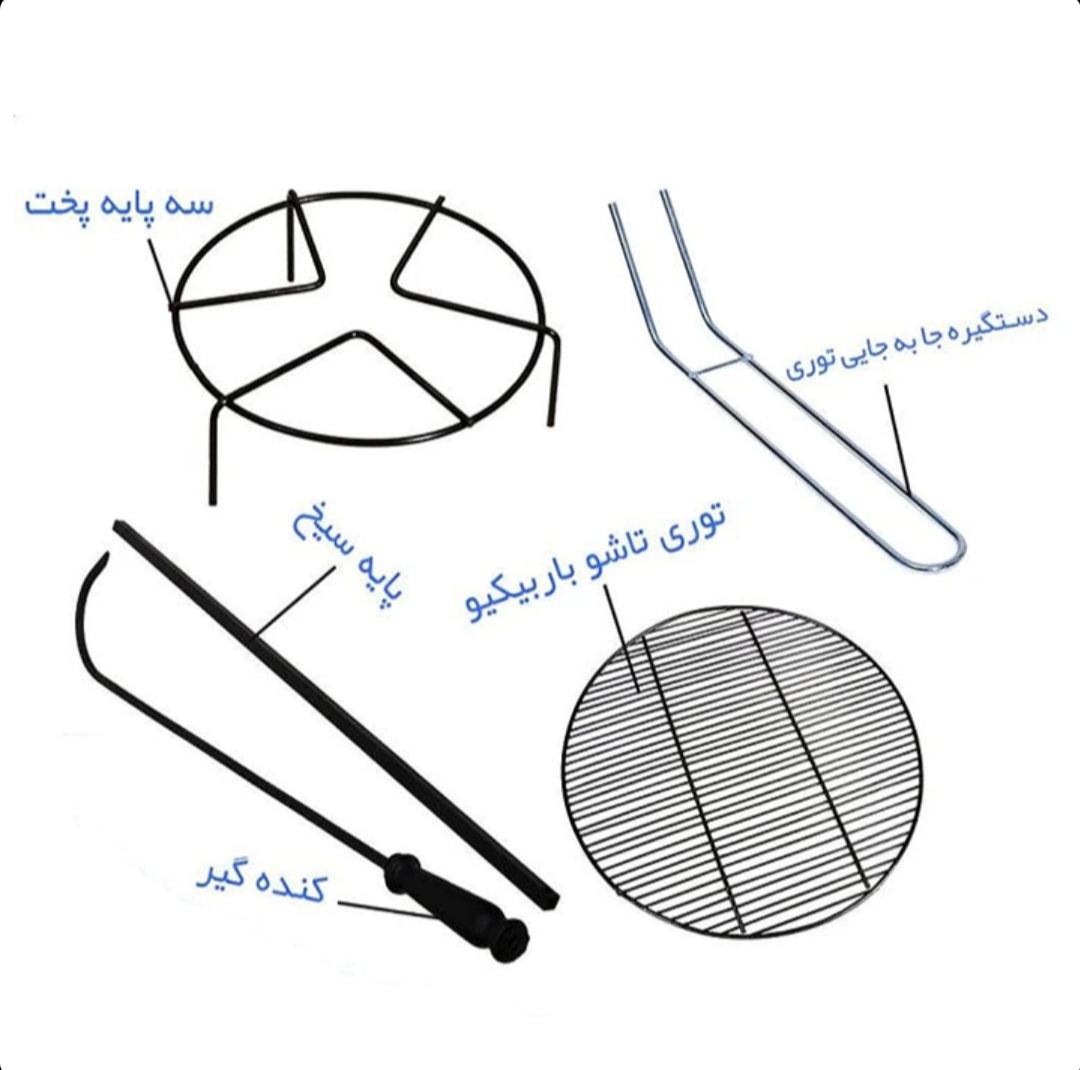 طبقه متحرک، میله آویز کتری، توری باربیکیو، پایه کتری، توری کف، بادبزن و انبر فلزی.
